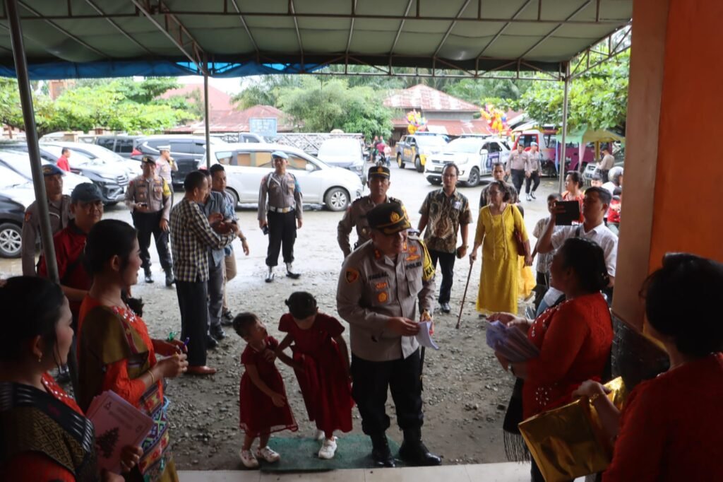 Kapolres Langkat AKBP Faisal Rahmat. HS, SIK. SH. MH dalam rangka Operasi Kepolisian Terpadu Operasi Lilin 2023 mengecek Pengaman tempat Ibadah Natal tahun 2023 di gereja kota Setabat Kabupaten Langkat, pada hari Senin (25/12/2023) pukul 09.30 wib.