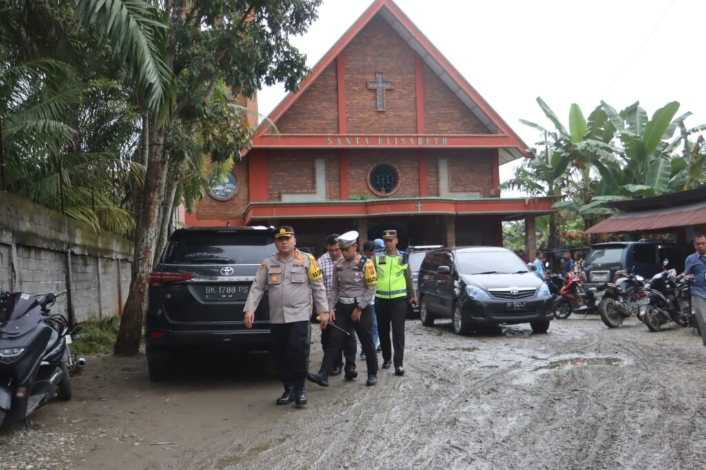 Kapolres Langkat AKBP Faisal Rahmat HS, SIK. SH. MH bersama rombongan mengecek Pengamanan Tempat Ibadah Natal tahun 2023 di gereja Khatolik Santa Elisabet dan Gereja HKBP Resort Setabat Jln. Sempurna Titi Putih Kelurahan Perdamaian Kecamatan Setabat Kabupaten Langkat.