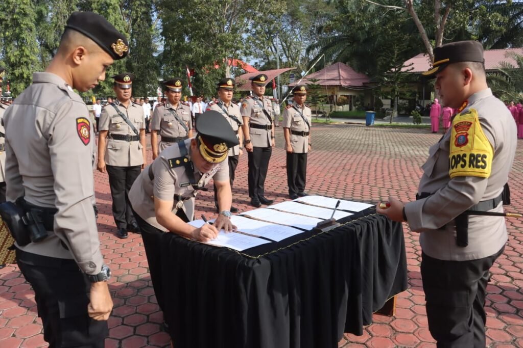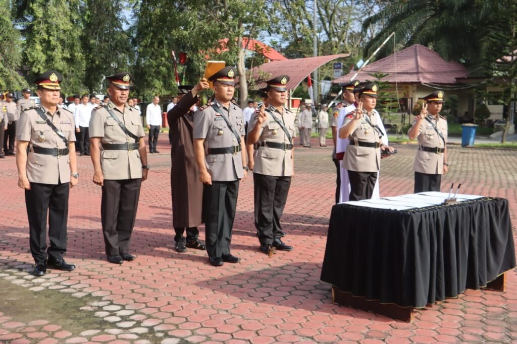 MEDIAINVESTIGASIMABES.CO.ID | Tanjung Pura – Kapolres Langkat AKBP Faisal Rahmat HS, SIK. SH. MH Memimpin Upacara serah terima jabatan Kabag Log ,Kasat Samapta, Kapolsek Kuala, Kapolsek Pangkalan Brandan, dan Kapolsek Tanjung Pura Polres Langkat di Lapangan Jananuraga Polres Langkat pada hari Senin (15/01/2024) Pukul 09.00 WIB.