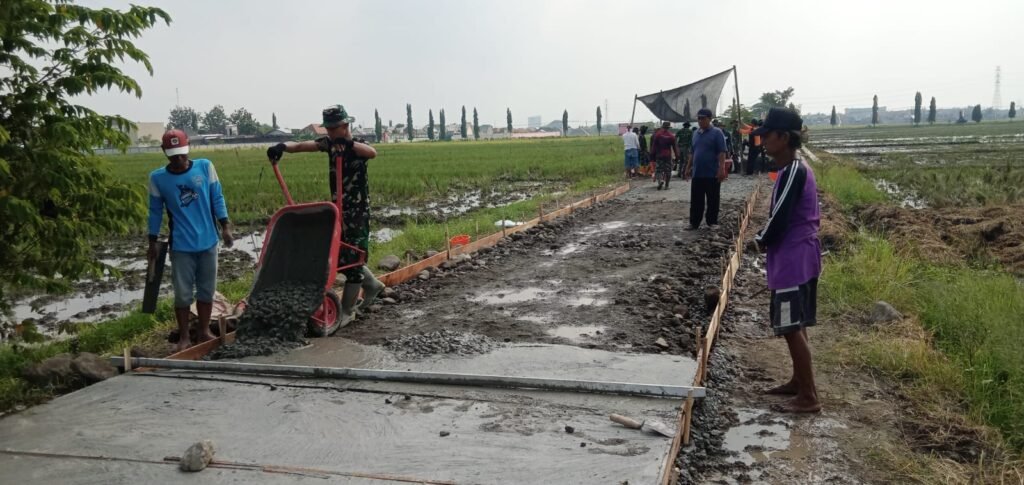 Tampak anggota TNI-Pori serta masyarakat guyub rukun bergotong royong menyelesaikan sasaran fisik tersebut agar selesai tepat waktu. Meski di bawah panasnya terik matahari tidak mengurangi sedikitpun semangat anggota Satgas dan warga ramai-ramai mengerjakan tahap demi tahap pengecoran jalan yang berlokasi di tengah persawahan desa Wirun Kecamatan Mojolaban, Kabupaten Sukoharjo tersebut.