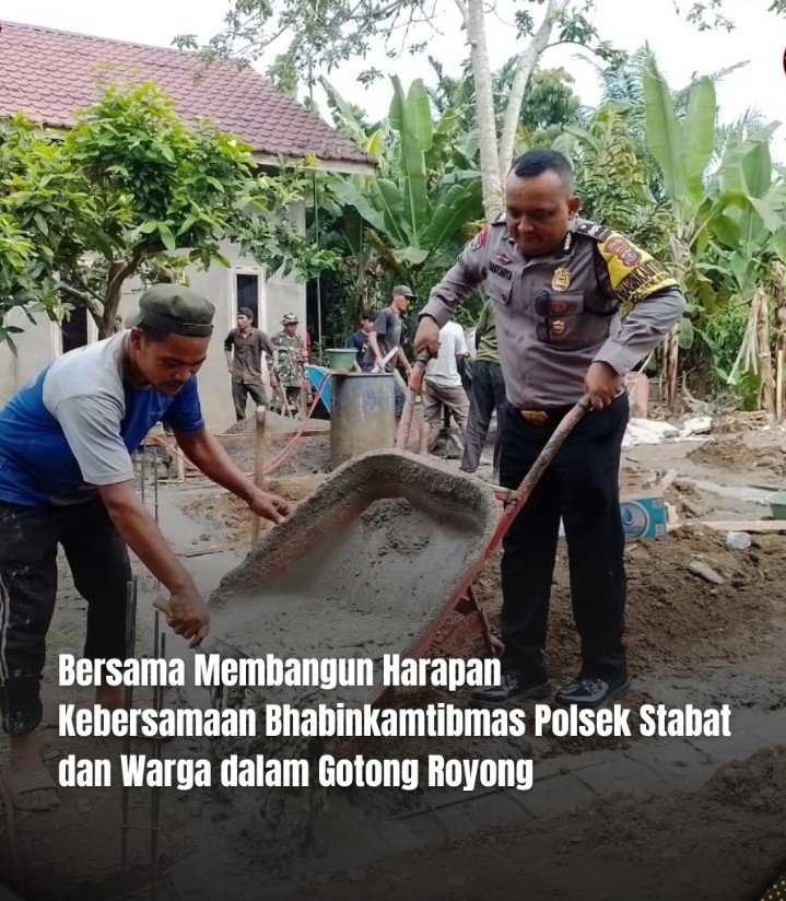 MEDIAINVESTIGASIMABES.CO.ID | Langkat – Bhabinkamtibmas Polsek Stabat Polres Langkat Polda Sumatera Utara, Aiptu Bastanta Tarigan, bersama Babinsa Paya Mabar, Sertu Slamat, melaksanakan kegiatan gotong royong dengan warga di Lingkungan 3, Kelurahan Paya Mabar, Kecamatan Stabat, Kabupaten Langkat. Kegiatan tersebut dilakukan untuk membantu membangun rumah salah seorang warga binaan. Jumat 31 Mei 2024