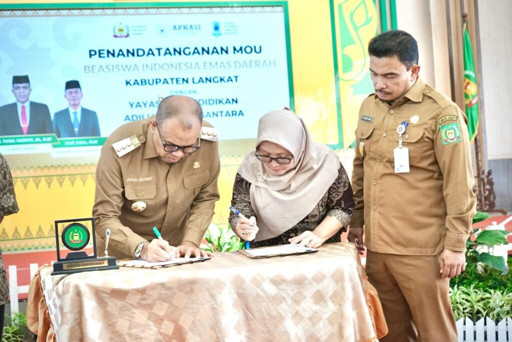 PJ. Bupati Langkat H. M. Faisal Hasrimy, AP., M.AP Tandatangani MoU dan Kerjasama dengan Yayasan Adihulung Pendidikan Nusantara untuk Program Beasiswa Indonesia Emas Daerah (BIE-D) dalam negeri dan luar negeri di Pendopo Jentera Malay Rumah Dinas Bupati, Selasa (04/06/2024) pagi.