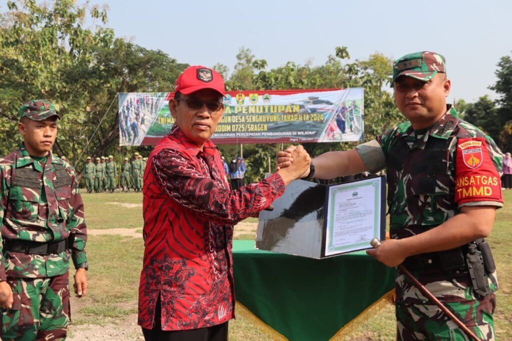 MEDIAINVESTIGASIMABES.CO.ID | Sragen – Kodim 0725/Sragen telah menyelesaikan kegiatan TNI Manunggal Membangun Desa atau disingkat TMMD Sengkuyung tahap II tahun 2024 di Ds. Jekawal Kec. Tangen Kab. Sragen. TMMD dilaksanakan selama 30 hari sejak dibuka pada 08/05/2024 oleh Wakil Bupati Sragen H.Suroto. Hari ini Kodim menggelar upacara penutupan TMMD di lapangan Silibau Ds. Jekawal, Kec.Tangen Kab. Sragen. Jum’at 07/06/2024.