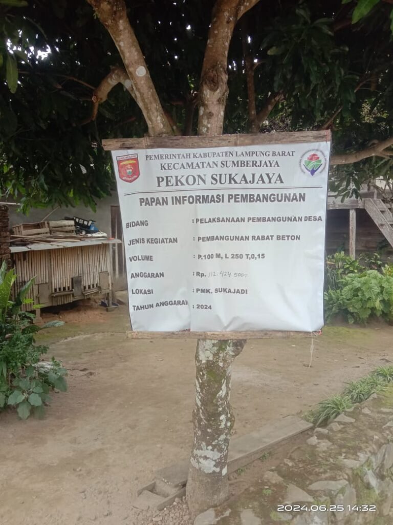Pembangunan jalan rabat beton di Pekon Sukajaya Pemangku Sukajadi itu berdasarkan papan informasi di sekitar lokasi menggunakan dana desa tahun 2024 dengan total Rp.112.424500,- (Seratus Dua Belas Juta Empat Ratus Dua Puluh Empat Ribu Lima Ratus Rupiah).