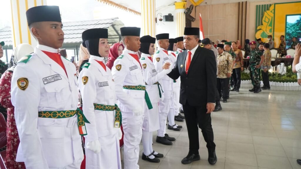 Suasana haru dan bangga menyelimuti prosesi pengukuhan 58 anggota Pasukan Pengibar Bendera Pusaka (Paskibraka) Kabupaten Langkat yang dilaksanakan di Jentera Malay, Rumah Dinas Bupati Langkat, pada Kamis (15/08). Penjabat (Pj) Bupati Langkat, H. M. Faisal Hasrimy, AP., M.AP, dengan khidmat memimpin acara pengukuhan ini, menyematkan tanda kehormatan kepada para anggota Paskibraka yang terdiri dari 32 putra dan 26 putri terbaik dari 139 sekolah di Langkat.