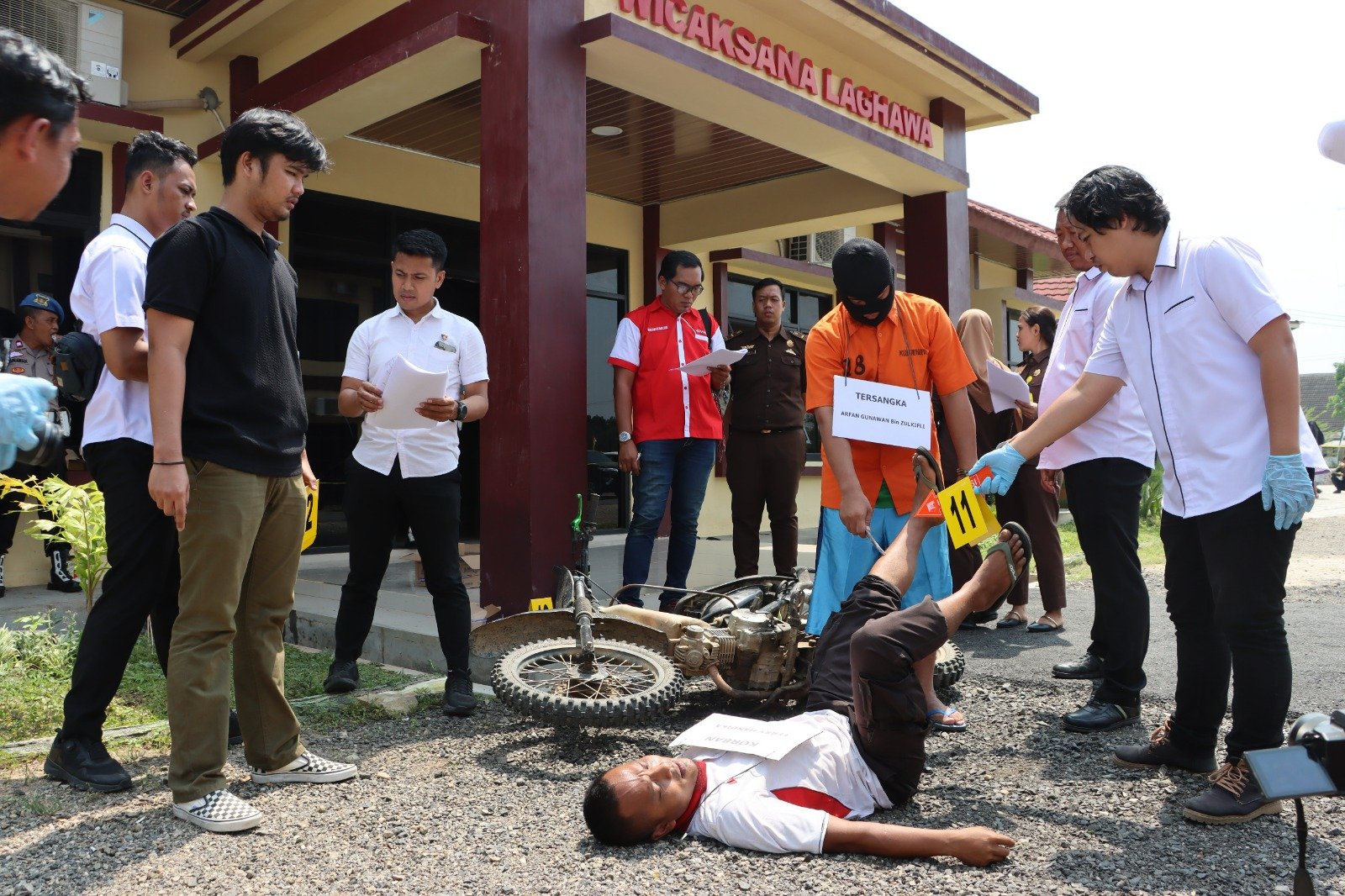 MEDIAINVESTIGASIMABES.CO.ID | Pringsewu ( Lampung ).Penyidik Satuan Reserse Kriminal (Satreskrim) Polres Pringsewu menggelar rekonstruksi kasus pembunuhan yang terjadi di Dusun Saribumi, Pekon Wates Selatan, Gadingrejo, Pringsewu, Lampung. Insiden tragis ini terjadi pada Jumat (26/7/2024) sore sekitar pukul 16.00 WIB, dan menyebabkan Feri Andika (34) tewas akibat ditikam berkali-kali dengan menggunakan pisau oleh tetangganya, Arfan Gunawan (27).