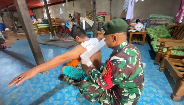 Tim medis dari Pos Aji Kuning memberikan pertolongan pertama dengan membersihkan luka korban menggunakan cairan infus steril, mengoleskan salep luka bakar, dan menutup luka dengan perban untuk mencegah infeksi lebih lanjut. Langkah cepat ini dilakukan sebagai bagian dari upaya satgas pamtas dalam menjaga kesehatan dan keselamatan warga di wilayah perbatasan.