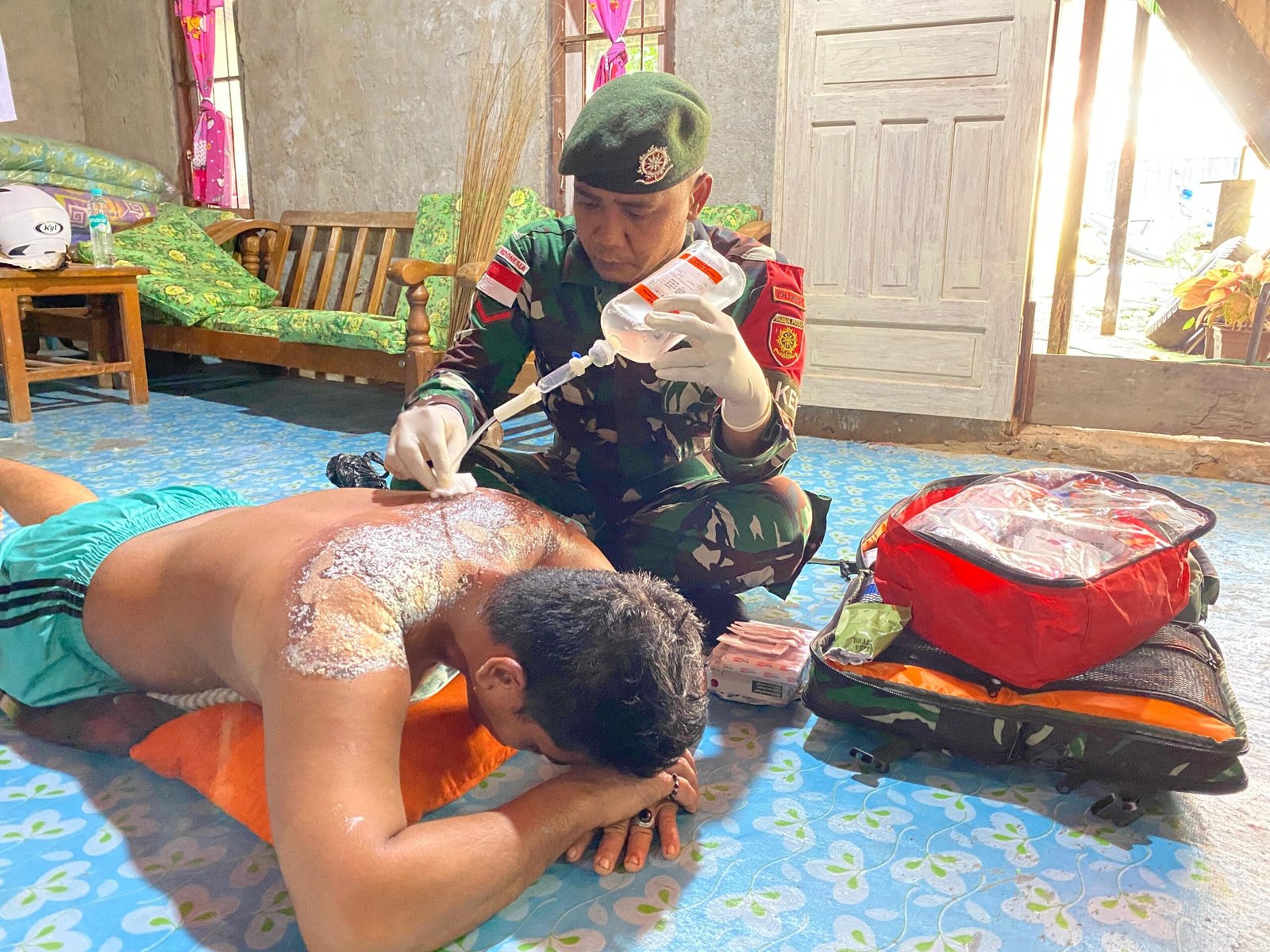 Tim medis dari Pos Aji Kuning memberikan pertolongan pertama dengan membersihkan luka korban menggunakan cairan infus steril, mengoleskan salep luka bakar, dan menutup luka dengan perban untuk mencegah infeksi lebih lanjut. Langkah cepat ini dilakukan sebagai bagian dari upaya satgas pamtas dalam menjaga kesehatan dan keselamatan warga di wilayah perbatasan.