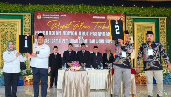 Perlu diketahui, Komisi Pemilihan Umum (KPU) Blora telah melakukan rapat pleno pengundian nomor urut paslon dan deklarasi damai di Pilkada Kabupaten Blora 2024, berlokasi di Gedung Graha Larasati, Jalan Taman Makam Pahlawan, Senin (23/9/2024).