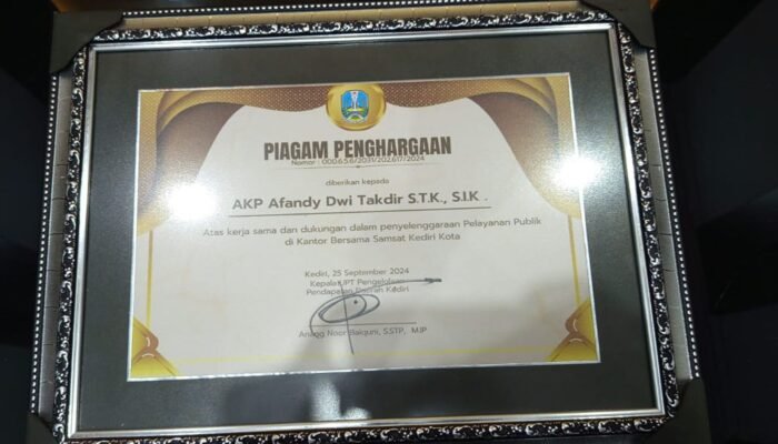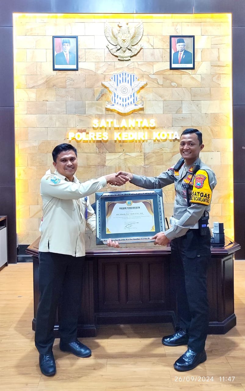 Hal tersebut ditandai dengan pemberian piagam penghargaan yang diserahkan langsung oleh Kepala UPT Pengelolaan Pendapatan Daerah Kediri, Anang Noor Balquni, kepada Kasatlantas Polres Kediri Kota AKP Afandy Dwi Takdir, Rabu 25 September 2024.