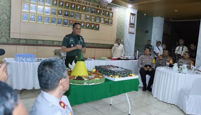Dandim Kolonel Putra Siregar memotong tumpeng kemudian diberikan kepada Kapolres Metro Jakarta Barat Kombes Pol M Syahduddi sebagai simbol harapan dan doa untuk kelangsungan sinergi antara kedua institusi keamanan ini.
