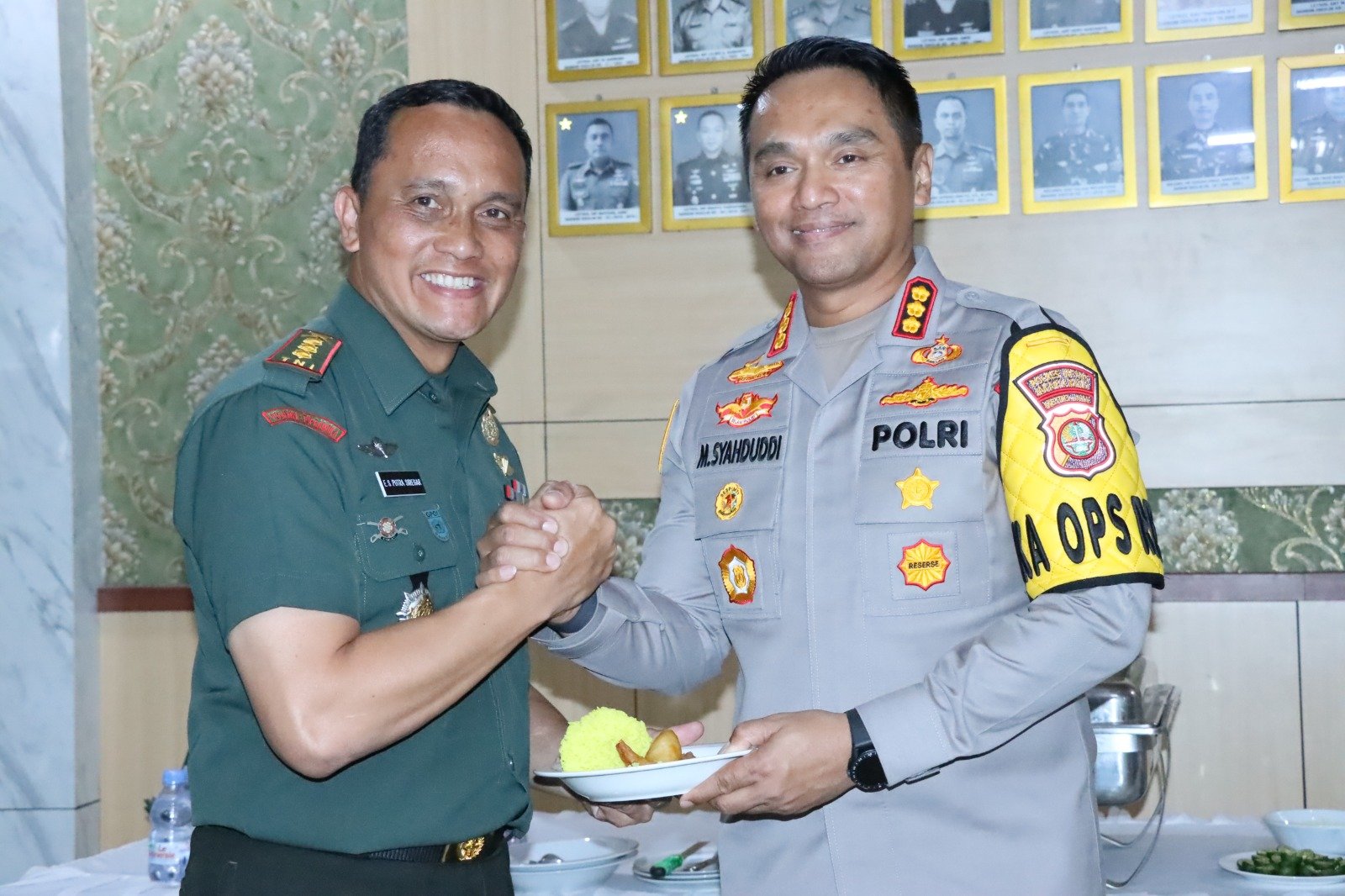 Dandim Kolonel Putra Siregar memotong tumpeng kemudian diberikan kepada Kapolres Metro Jakarta Barat Kombes Pol M Syahduddi sebagai simbol harapan dan doa untuk kelangsungan sinergi antara kedua institusi keamanan ini.