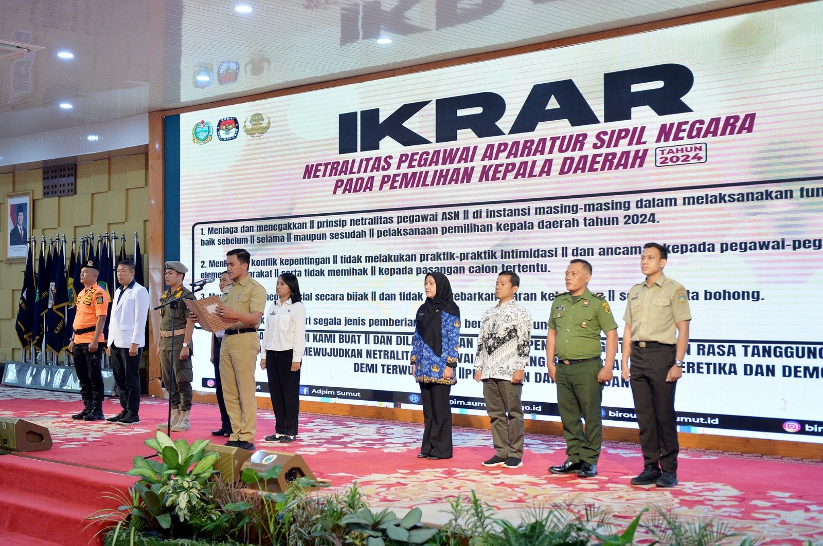 Deklarasi Netralitas ASN diikuti oleh ASN se- Sumut. Turut hadir pada kesempatan tersebut Pangdam I/Bukit Barisan Mochamad Hasan, Kajati Sumut Idianto dan Kepala OPD se-Pemprov Sumut, Ketua KPU, Ketua Bawaslu, Bupati/Walikota se-Sumut dan diikuti seluruh Kabupaten/Kota secara virtual. (Suf)