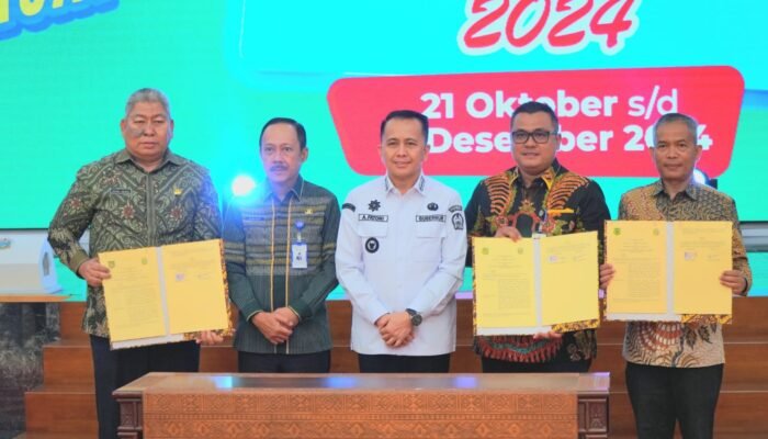Pj Bupati Langkat H. M. Faisal Hasrimy, AP., M.AP., yang diwakili oleh Sekretaris Daerah (Sekda) H. Amril, S.Sos., M.AP., menghadiri acara penandatanganan perjanjian kerjasama terkait optimalisasi pemungutan pajak dan sinergitas pemungutan opsen di Aula Raja Inal, Kantor Gubernur Sumatera Utara, Jumat (25/10/2024) siang.