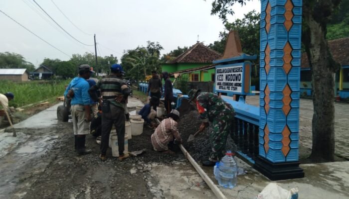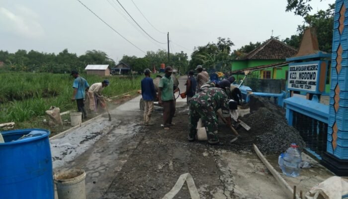 MEDIAINVESTIGASIMABES.CO.ID | Boyolali – Babinsa Koramil 15/Andong Kodim 0724/Boyolali Sertu Agung Purwanto bersama masyarakat binaan melaksanakan kerja bakti pengecoran jalan di Dukuh Tangkil Desa Kedungdowo Kecamatan Andong Kabupaten Boyolali. Selasa ( 12/11/24)