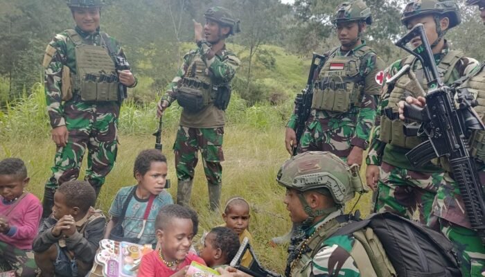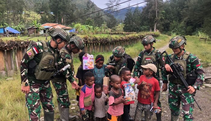 MEDIAINVESTIGASIMABES.CO.ID | Mageabume Puncak, MediaHabema – One of the military units under the command of the Indonesian Armed Forces Operational Command HABEMA, the Task Forces of the Raider Infantry Battalion 323/Buaya Putih Kostrad, is currently conducting mobile security at the border of Indonesia and Papua New Guinea, especially in the Puncak Regency, Papua Tengah Province. On Thursday, 14 November 2024, the 323 Task Forces, especially Wuloni Post led by Captain Honest, demonstrated social concern by distributing free packages of basic necessities to some residents of Kondokwe Village, Mageabume District.