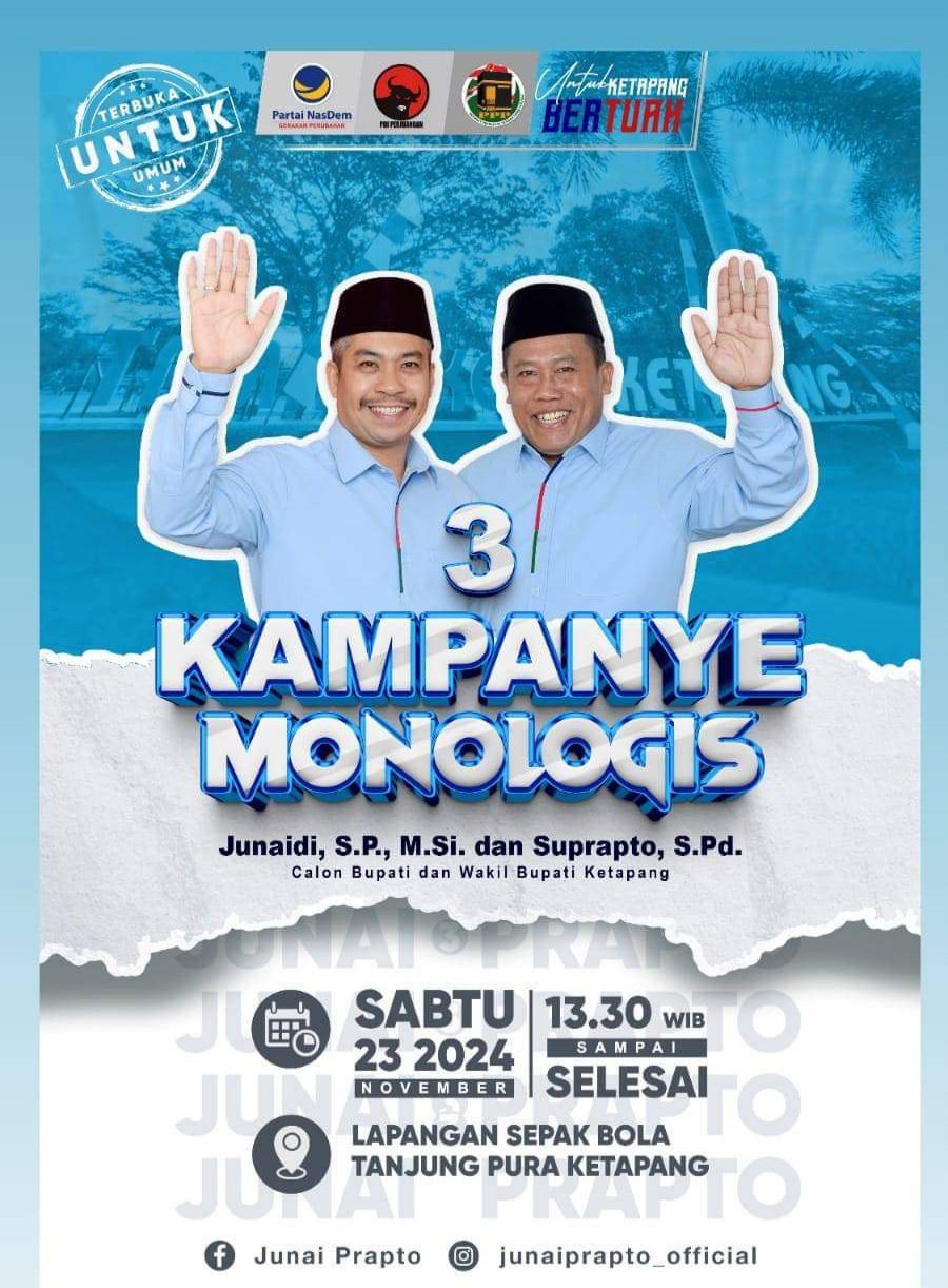 Menjelang hari pencoblosan Pilkada Serentak, Pasangan Calon Bupati Dan Wakil Bupati Ketapang Nomor Urut 3 Junaidi-Suprapto akan melaksanakan kampanye akbar (monologis) di Lapangan Sepak Bola Tanjungpura Kabupaten Ketapang,Pada Sabtu 23 November 2024, pukul 13.30 wib.