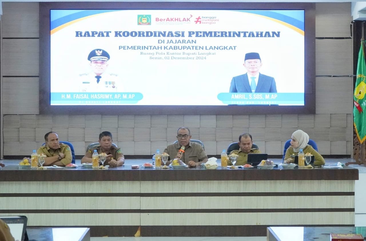 MEDIAINVESTIGASIMABES.CO.ID | Stabat, Langkat (SUMUT) ~ Pj Bupati Langkat, H.M. Faisal Hasrimy, AP, M.AP, memimpin rapat koordinasi pemerintahan di Ruang Pola Kantor Bupati Langkat, Senin (2/12/2024). Rapat tersebut bertujuan memperkuat sinergitas perangkat daerah dalam mendukung pelaksanaan delapan misi Asta Cita dan 17 program prioritas nasional yang digagas oleh Presiden Republik Indonesia.