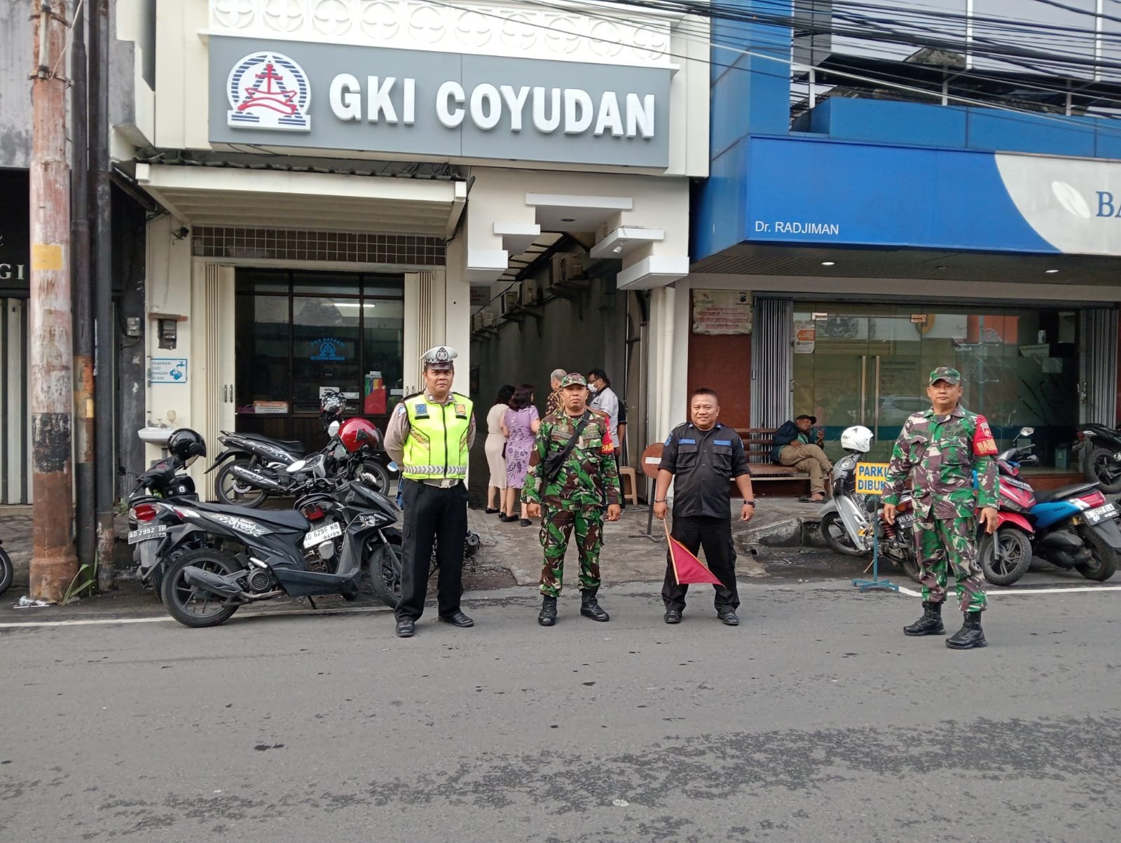 MEDIAINVESTIGASIMABES.CO.ID | Surakarta – Babinsa Kelurahan Jayengan Koramil 03 Serengan Kodim 0735 Surakarta, Serka Priyanto dan Serka Rohmad laksanakan pengamanan guna memberikan keamanan dan kenyamanan dalam menjalankan ibadah Natal dan Tahun baru 2025 umat Nasrani di GKI Coyudan Jayengan Serengan Kota Surakarta, Minggu (08/12/2024) pukul 07.00 WIB.