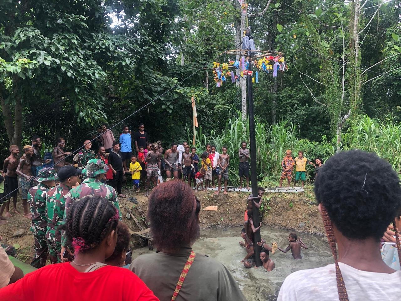 Di tempat terpisah, Ondoafi Bapak Hore Kuntuy (52 thn) mengapresiasi pelaksanaan lomba panjat pohon pinang dan makan kerupuk tersebut dan bangga atas kepedulian personel Pos Kalilapar Satgas Yonif 131/BRS.