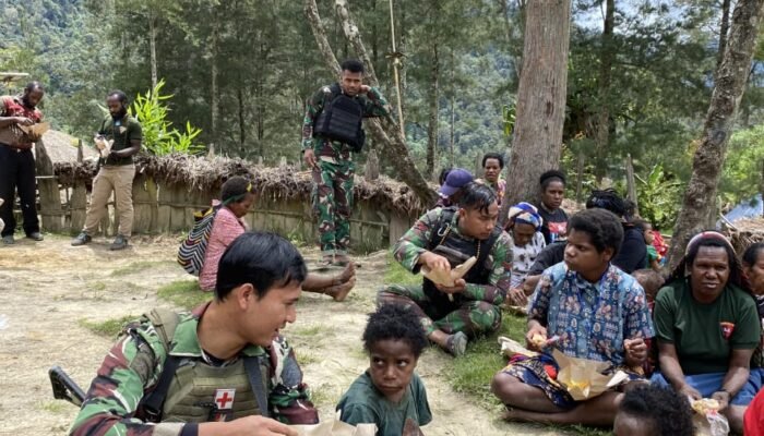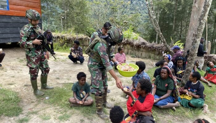 MEDIAINVESTIGASIMABES.CO.ID | Mageabume Puncak, MediaHabema – One of the military units under the command of the Indonesian Armed Forces Operational Command HABEMA, the Task Forces of the Raider Infantry Battalion 323/Buaya Putih Kostrad, is currently conducting mobile security at the border of Indonesia and Papua New Guinea, especially in the Puncak Regency, Papua Tengah Province. On Monday, 30 December 2024, the 323 Task Forces, especially Pintu Jawa Post led by First Lieutenant Caroko, demonstrated social concern by providing free lunch to residents of Gelegi Village, Mageabume District.