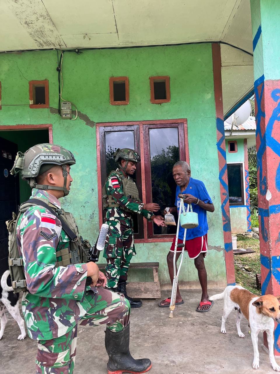 Danpos (Komandan Pos) Aisyo Lettu Inf Aby Juniavian Kusuma,S.Tr.(Han) beserta personil Pos Aisyo berkeliling kampung kunjungi warga dari rumah ke rumah dengan membagikan bubur kacang hijau. Bentuk kepedulian yang dilakukan Satgas Yonif 762/VYS menarik perhatian Manfred Baho selaku Kepala Kampung Aisyo, dirinya sangat mengapresiasi dan mengucapkan terima kasih kepada personil Satgas Yonif 762/VYS. (Yonif 762)