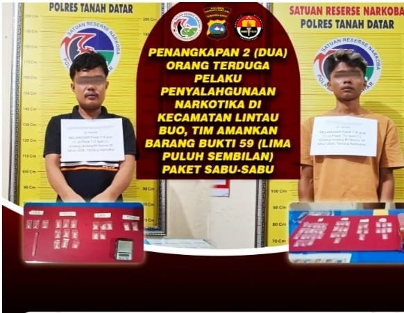 MEDIAINVESTIGASIMABES.CO.ID | Tanah Datar – Dua orang pemuda yang diduga yang melakukan tindak pidana penyalahgunaan Narkotika jenis Sabu Sabu diringkus Tim Tarantula Satres Narkoba Polres Tanah Datar dilokasi yang berbeda di Kecamatan Lintau Buo , Pada Selasa (07.01.2025) .