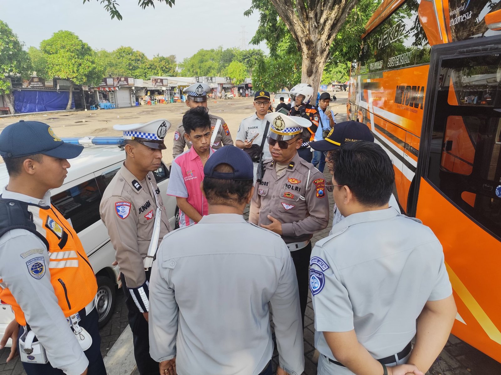 Setelah menyelesaikan ramp check pada bus pariwisata, tim melanjutkan kegiatan serupa di area Parkir Bus Wisata Sunan Giri.