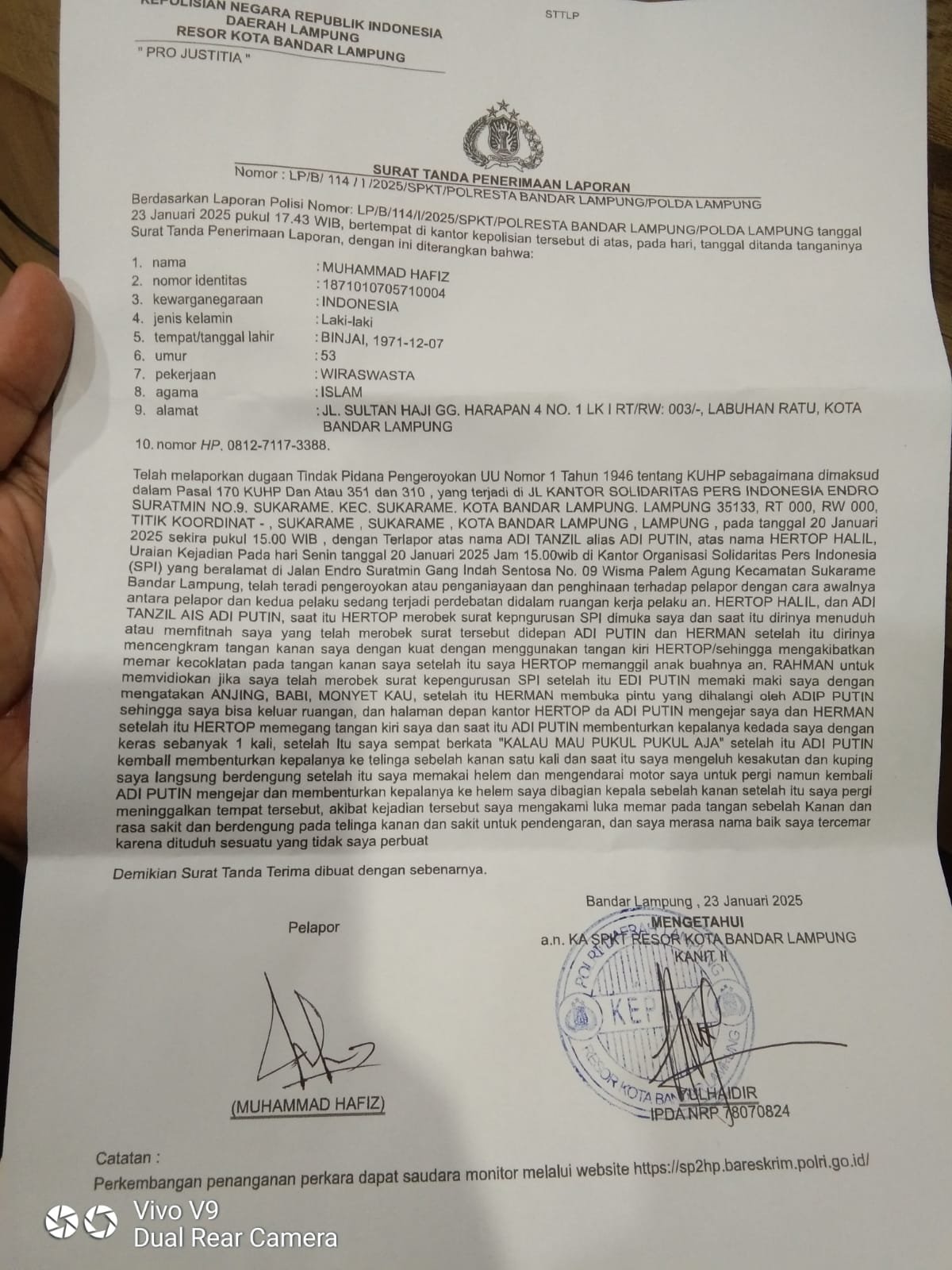 Tidak terima dengan tindakan ketua dan wakil SPI tersebut, Hafiz melaporkan ke POLRESTA Bandar Lampung dengan no LP /B/114/1/2025/SPKT/POLRESTA BANDAR LAMPUNG/POLDA LAMPUNG tanggal 23 Januari 2025.