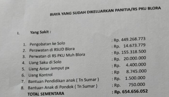 Sementara itu, Dirut RS PKU Muhammadiyan Blora, Dokter Tegar saat dikonfirmasi, dia mengatakan, untuk biaya yang sudah dikeluarkan panitia/RS PKU Blora, bagi yang sakit antara lain :
