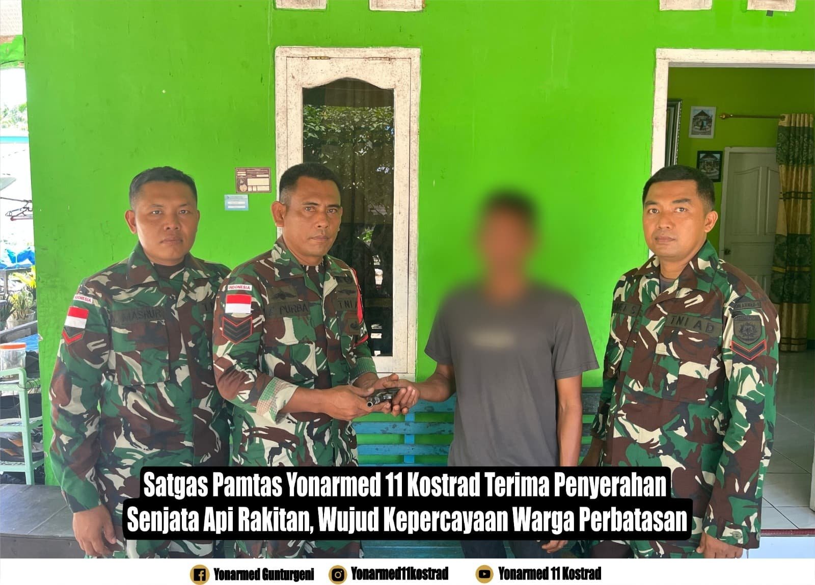 Penyerahan dilakukan langsung di kediaman warga berinisial A (50), seorang petani setempat. Berawal dari komunikasi yang dibangun secara persuasif dan humanis oleh personel Satgas Pamtas Yonarmed 11 Kostrad, A akhirnya menyampaikan niatnya untuk menyerahkan senjata rakitan yang telah lama disimpannya.