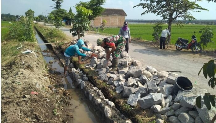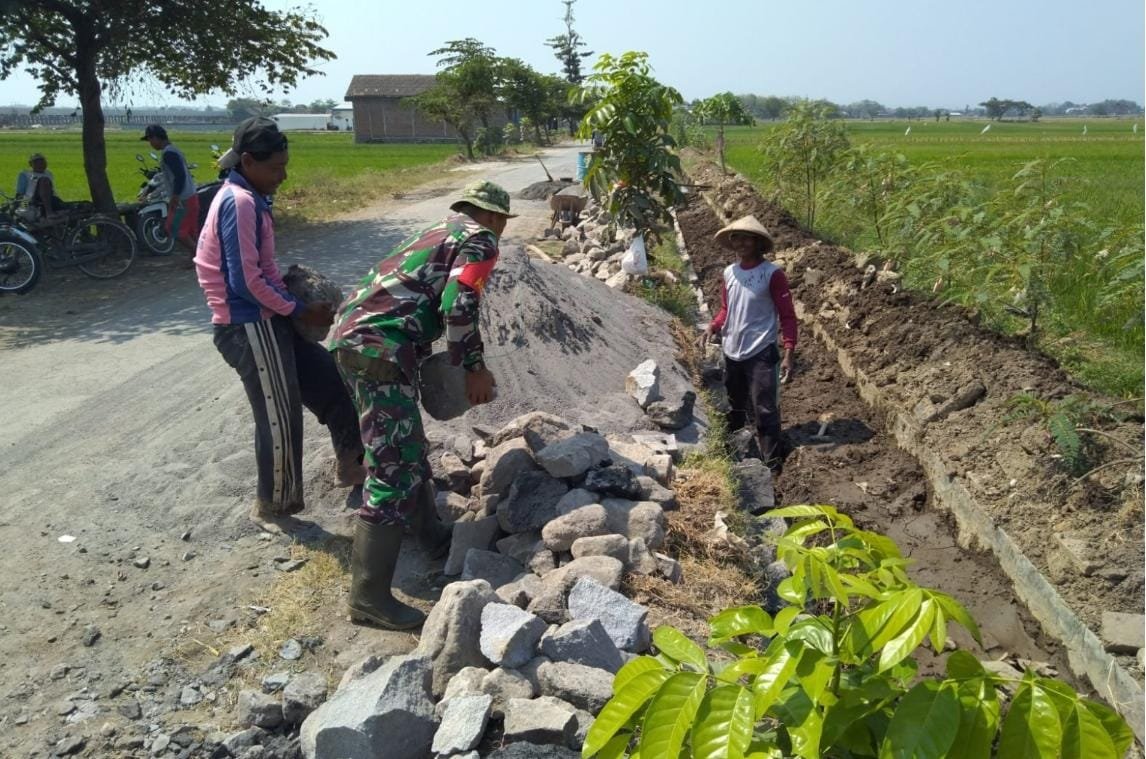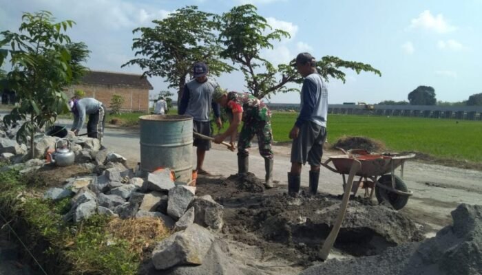 MEDIAINVETIGASIMABES.CO.ID | Boyolali – Babinsa Koramil 11/Ngemplak Kodim 0724/Boyolali Serda Waluyo bersama warga melaksanakan Karya Bhakti pembuat talud Jalan areal persawahan Desa Dibal Kecamatan Ngemplak Kabupaten Boyolali. Senin ( 12/05/25)