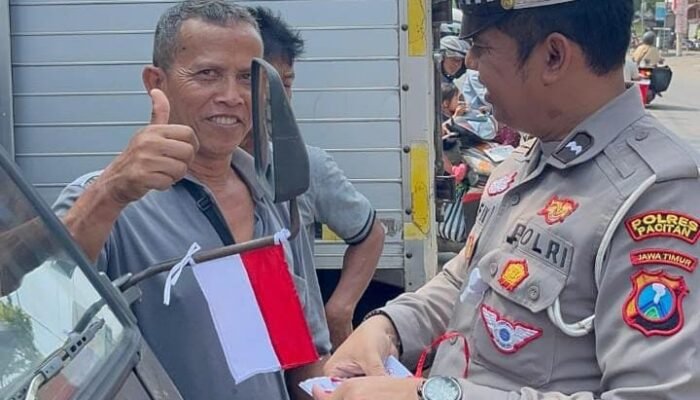 Dengan turun langsung ke jalan, personel Unit Turjagwali Satlantas Polres Pacitan Polda Jatim membagikan bendera Merah Putih kepada para pengendara yang melintas di perempatan lampu merah Penceng, Selasa (5/8/2025).