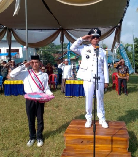 Prosesi upacara berlangsung tertib dan penuh rasa nasionalisme. Pasukan pengibar bendera merah putih tampil dengan disiplin, diiringi lagu kebangsaan Indonesia Raya yang dinyanyikan dengan penuh semangat oleh seluruh peserta. Suasana semakin semarak dengan hadirnya atribut dan hiasan bernuansa merah putih yang menghiasi area lapangan desa.