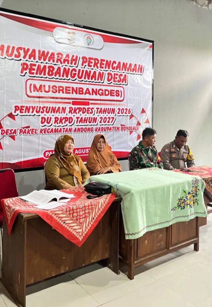 MEDIAINVESTIGASIMABES.CO.ID | Boyolali – Musyawarah Perencanaan Pembangunan Desa (Musrenbangdes) Tahun 2027 Desa Pakel, Kecamatan Andong, Kabupaten Boyolali. Kegiatan tersebut dihadiri oleh berbagai unsur, mulai dari perangkat desa, tokoh masyarakat, hingga aparat TNI-Polri.Rabu (20/08/2025).