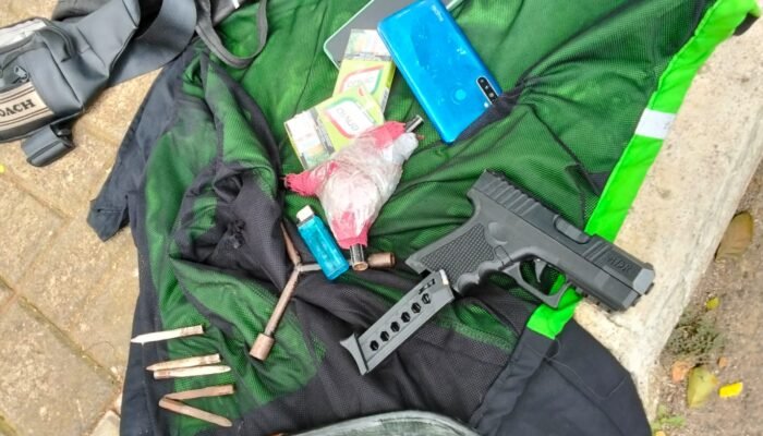 Dari hasil penggeledahan, polisi menemukan sejumlah barang bukti mencurigakan dari tas jinjing pelaku, di antaranya satu pucuk senjata api rakitan jenis FN berikut dua butir amunisi, dua kunci leter T dengan empat mata kunci, serta sebilah pisau lengkap dengan sarungnya.