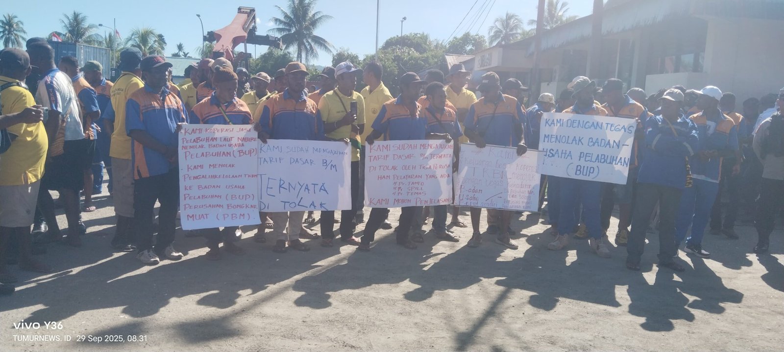 Para buruh membawa baliho dan pamflet berisi aspirasi utama mereka, yakni menuntut penyesuaian tarif bongkar muat yang tertunda sejak 2018 serta menolak keberadaan Badan Usaha Pelabuhan (BUP) yang dinilai masuk tanpa persetujuan pemerintah daerah maupun masyarakat adat.