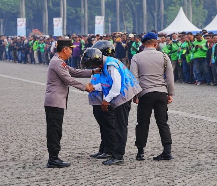 Pantauan di lokasi, ratusan pengemudi ojol hadir dengan mengenakan rompi biru bertuliskan “Jaga Jakarta bersama Polda Metro Jaya”. Suasana apel semakin khidmat ketika Kapolri secara simbolis menyerahkan helm dan rompi kepada perwakilan ojol. Turut hadir Wakapolri Komjen Dedi Prasetyo, Kapolda Metro Jaya Irjen Asep Edi Suheri, pejabat utama Mabes Polri, serta jajaran Kapolres Polda Metro Jaya.
