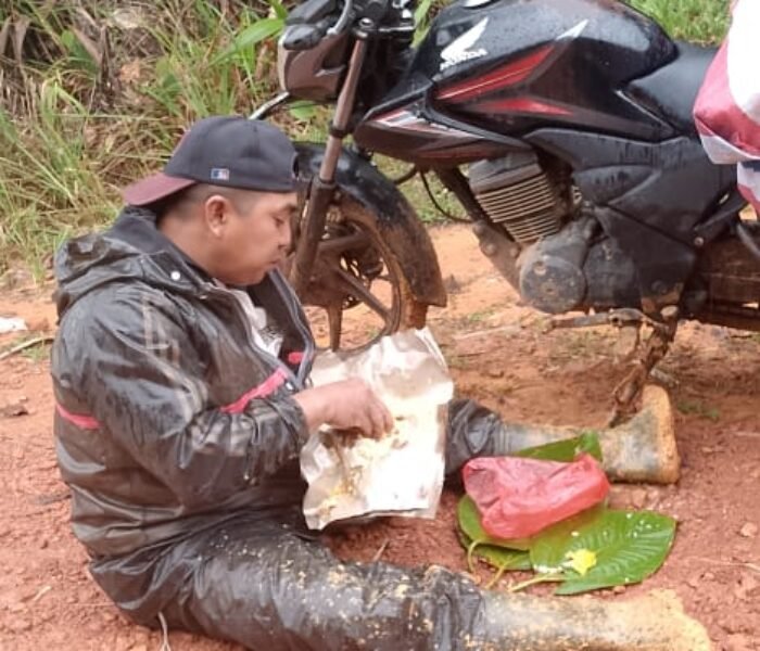 “Berangkat untuk pergi mengajar dari rumah jam empat pagi dan harus sampai di sekolahan jam tujuh,namun berjam jam masih di sejumlah titik jalan yang becek parah,acap kali motornya saat termasuk ke lobang jalan dan terpeleset ke pinggir jalan dan di bantu murid murid SMPN 02.harapan baru yang pergi kesekolahnya berjalan kaki,karena susahnya akses jalan.ungkap Sandi