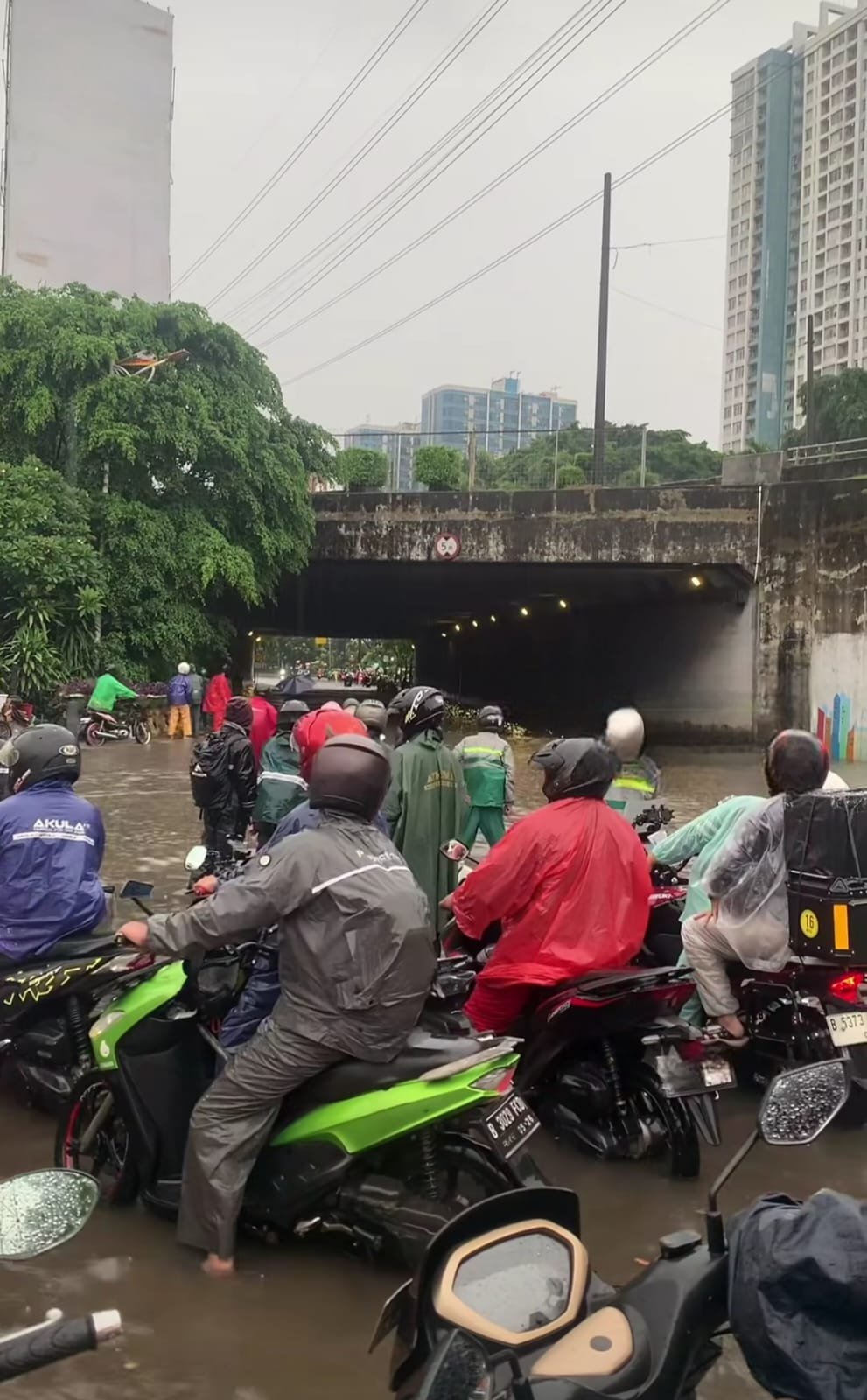 Situasi banjir tersebut juga direkam warga dan beredar di media sosial. Salah satu unggahan dari akun Instagram @kemssann memperlihatkan deretan motor yang terhenti di bawah flyover akibat tingginya genangan.