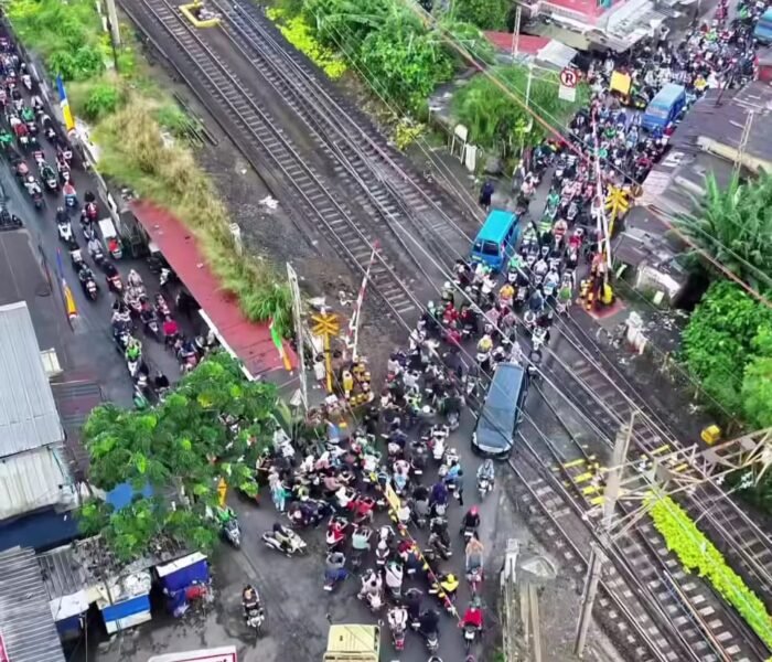 Selain itu, perlintasan kereta yang berada tidak jauh dari stasiun membuat situasi makin kompleks. Ketika palang pintu kereta menutup, antrean kendaraan mengular cukup panjang. Setelah palang kembali terbuka, pengendara motor kerap saling berebut jalur sehingga memicu kemacetan susulan.