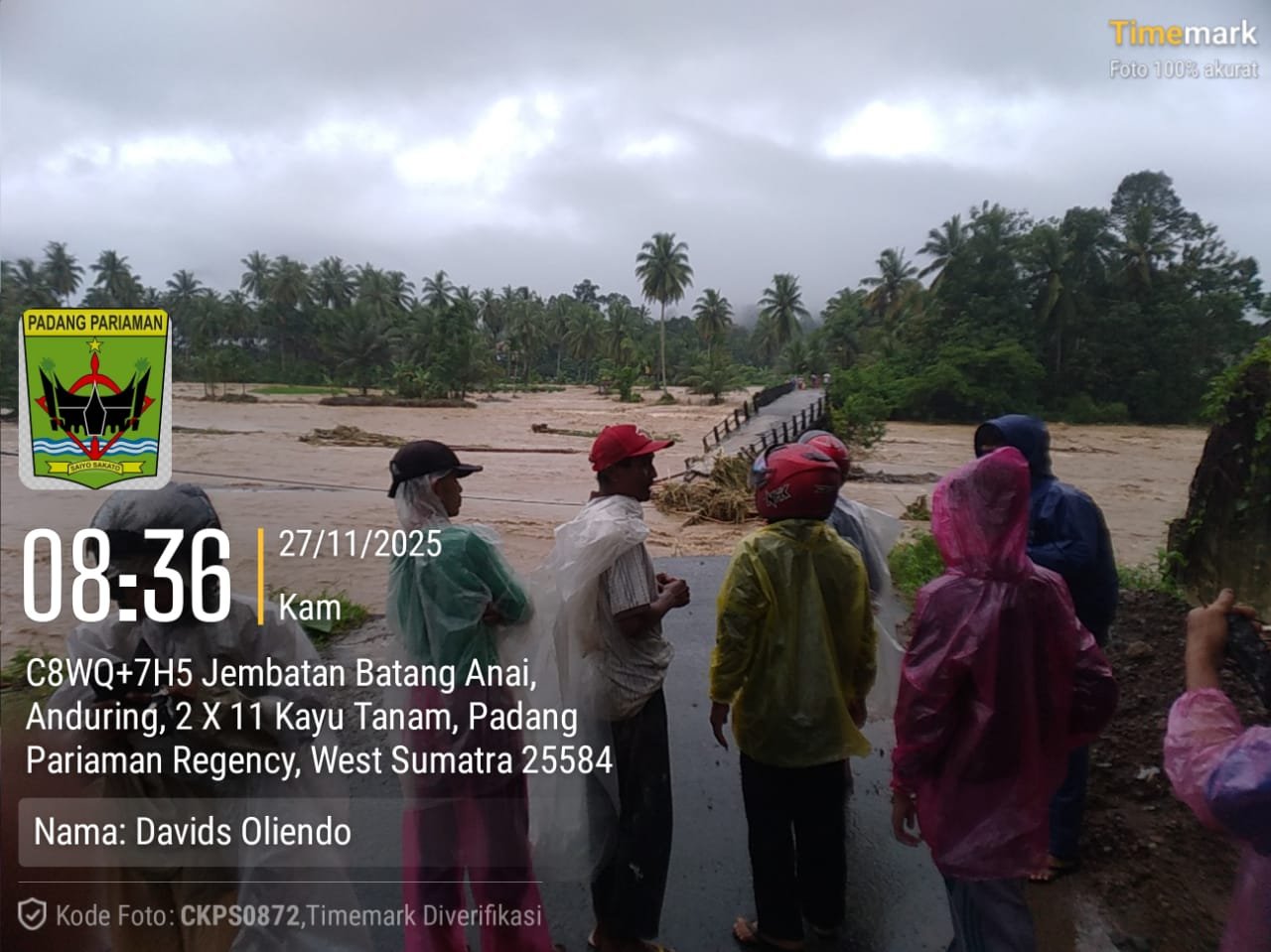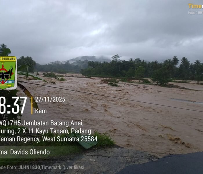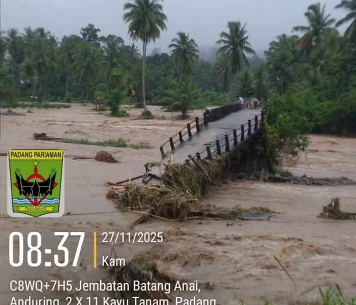 MEDIAINVESTIGASIMABES.CO.ID | KAYUTANAM (PADANG PARIAMAN) — Jembatan utama yang menghubungkan Nagari Anduring dengan Pasar Kayutanam, Kecamatan 2×11 Kayutanam, Sumatera Barat, dilaporkan terputus akibat galodo atau banjir bandang yang dipicu luapan air Batang Anai. Arus deras yang terjadi pada hari ini menghanyutkan sebagian struktur jembatan hingga tidak dapat lagi dilalui kendaraan maupun pejalan kaki, Kamis (27/11/2025).