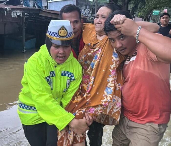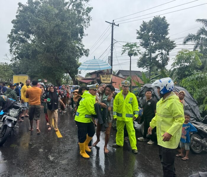 Selain pengaturan lalu lintas, petugas turut bergerak cepat membantu warga melakukan evakuasi ke titik yang lebih aman dari banjir.