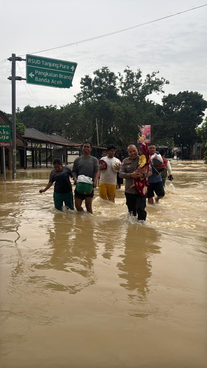 Selain pengaturan lalu lintas, petugas turut bergerak cepat membantu warga melakukan evakuasi ke titik yang lebih aman dari banjir.