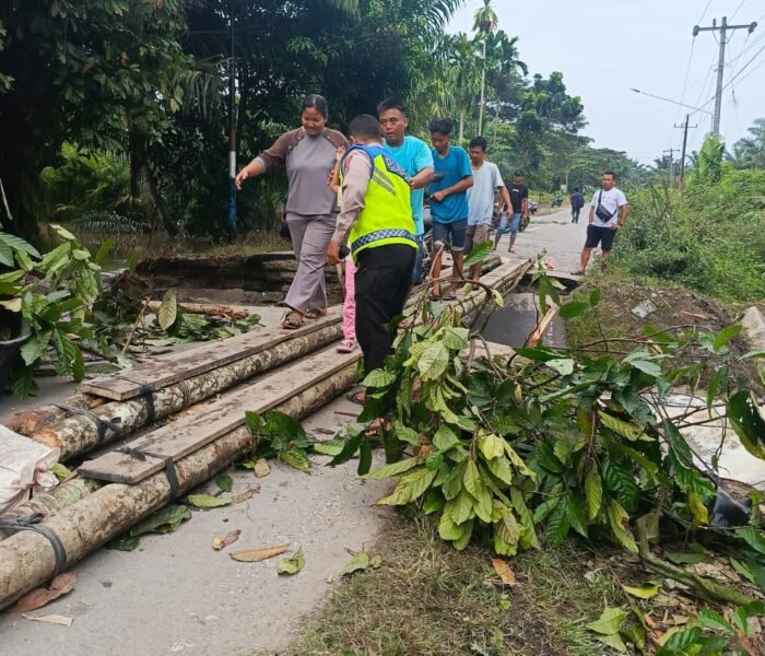 MEDIAINVESTIGASIMABES.CO.ID | LANGKAT (SUMATERA UTARA) — Sat Lantas Polres Langkat melalui Pos Lantas Polsek Hinai melaksanakan pemantauan dan penyampaian informasi terkini terkait kondisi jalur Hinai–Padang Tualang yang terputus akibat banjir, Minggu (30/11/2025).