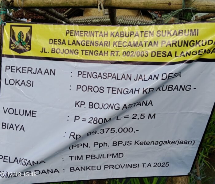 MEDIAINVESTIGASIMABES.CO.ID | SUKABUMI (JAWA BARAT) ~ Kepala Desa ( Kades ) Langensari Kecamatan Parungkuda Kabupaten Sukabumi, Anda Supriadi, merealisasikan Bantuan Provinsi (Banprov) Tahun Anggaran (TA) 2025 dengan mengerjakan pengerasan jalan desa sepanjang 280 meter dan lebar 2,5 meter proyek senilai Rp. 99.375.000.