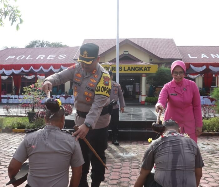Rangkaian upacara diawali dengan laporan Komandan Upacara, penghormatan pasukan, pelantikan dan penyematan tanda pangkat kepada personel yang naik pangkat, serta tradisi penyiraman sebagai simbol penyucian dan tanggung jawab baru yang dilakukan oleh Inspektur Upacara didampingi Ketua Bhayangkari Cabang Langkat. Kegiatan dilanjutkan dengan amanat Inspektur Upacara dan pembacaan doa.