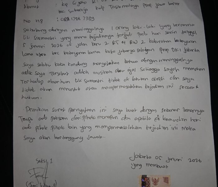 MEDIAINVESTIGASIMABES.CO.ID | JAKARTA SELATAN — Seorang pria ditemukan meninggal dunia di sebuah rumah kontrakan di Jalan Baru II RT 04/02 No. 6, Kelurahan Kebayoran Lama Utara, Kecamatan Kebayoran Lama, Jakarta Selatan, pada Senin (5/1/2026) sore.