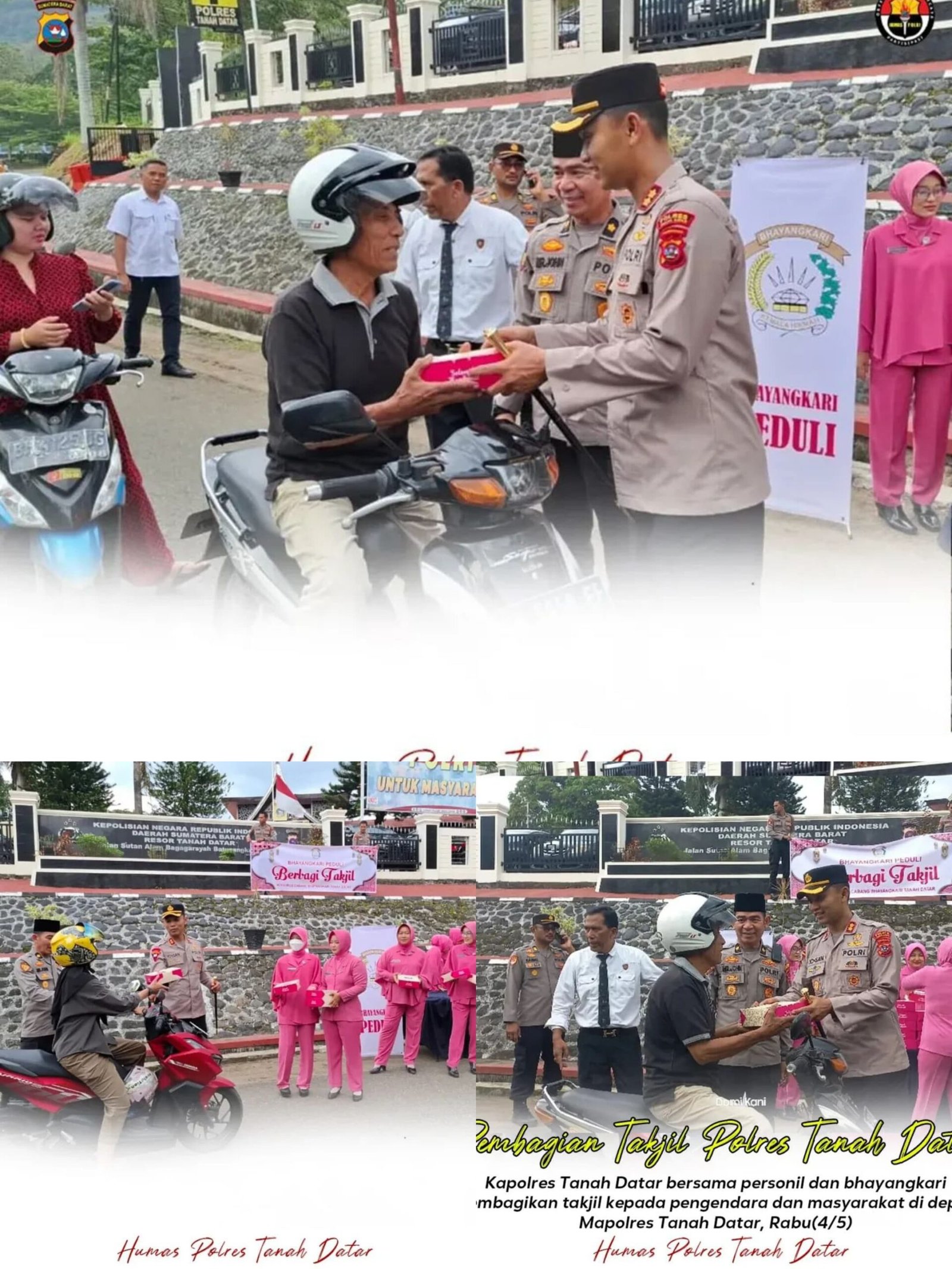 MEDIAINVESTIGASIMABES.CO.ID | TANAH DATAR (SUMATERA BARAT) ~ Menjelang waktu berbuka puasa, suasana di depan Mapolres Tanah Datar tampak berbeda. Pada Rabu 4 Maret 2026 pukul 17.00 WIB, Kapolres Tanah Datar AKBP Dr. Nur Ichsan Dwi Septiyanto, S.H., S.I.K., M.I.K., jajaran personel dan Ketua Bhayangkari Cabang Tanah Datar turun langsung ke jalan untuk membagikan takjil kepada para pengendara dan pejalan kaki yang melintas.