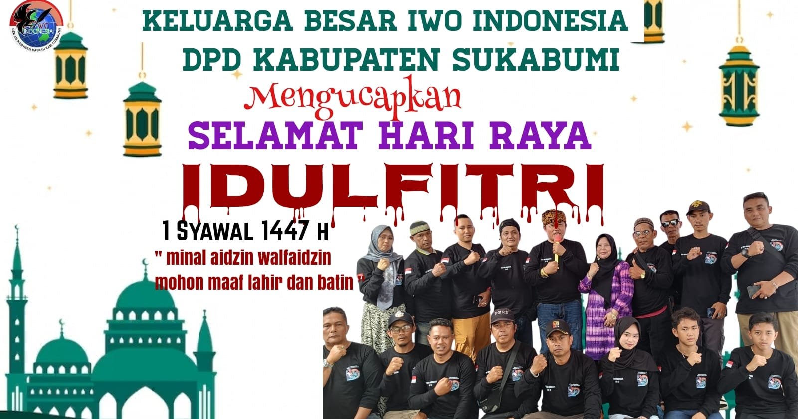 MEDIAINVESTIGASIMABES.CO.ID | SUKABUMI (JAWA BARAT) — Keluarga Besar Ikatan Wartawan Online (IWO) Indonesia Dewan Pimpinan Daerah (DPD) Kabupaten Sukabumi menyampaikan ucapan Selamat Hari Raya Idul Fitri 1 Syawal 1447 Hijriah kepada seluruh umat Muslim, khususnya masyarakat Kabupaten Sukabumi.